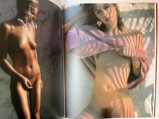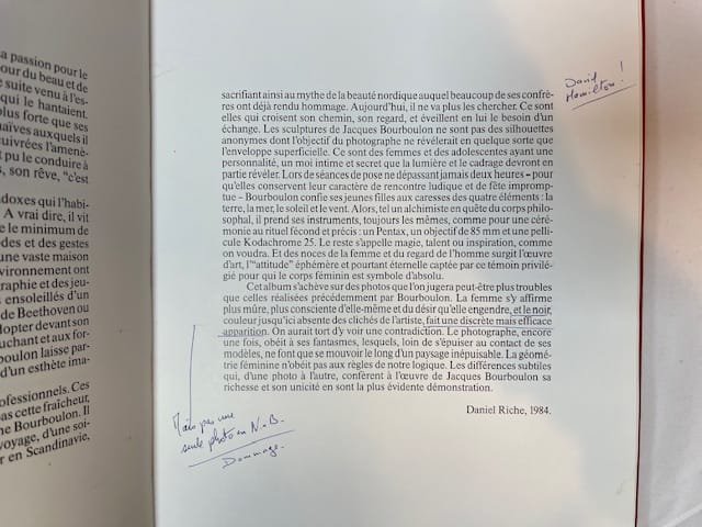 First edition, 1984. Hardback in dust jacket. Red paper-covered boards with stamped orange lettering to front and spine. Decorated endpapers. Unpaginated. Short (3 pages) introduction in French by Daniel Riche. Previous owner’s rubber stamp to front and rear paste-down and title page. Related col. illustration neatly affixed to dedication page. Pen annotations to introductory text. Otherwise a clean, unmarked copy. Jacket a little scuffed to edges and with a closed tear to tail of upper spine fold; discreetly repaired to reverse. *** A very good copy of Bourboulon’s infamous collection of photographs of nude and semi-nude young women, taken on Ibiza.