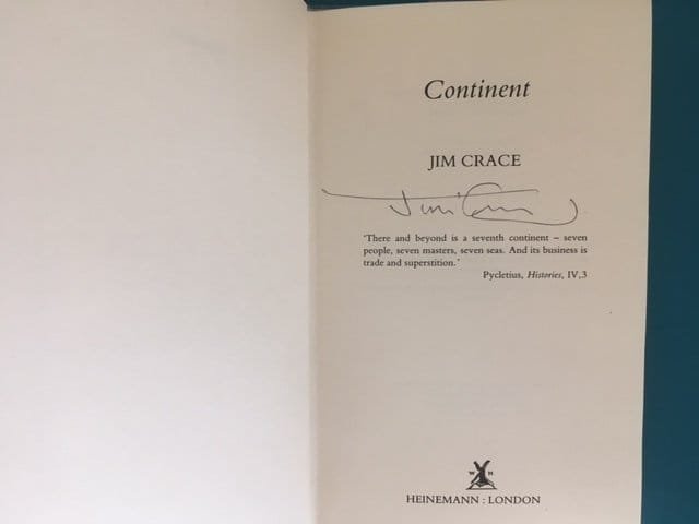 Black cloth boards with gilt lettering to spine. SIGNED by author to title page. In price-clipped dust jacket, sunned to spine. Tiny nick to head of upper fold, neatly repaired to reverse. *** First printing of Jim Crace’s remarkable debut novel, in a first state dust jacket (without the quote “You can afford to make the journey” to front panel).