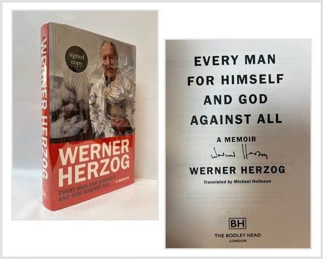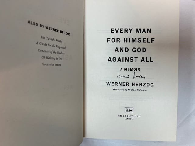 Translated by Michael Hofmann. First UK edition; first printing. Hardback in dust jacket. SIGNED by Werner Herzog to title page. 335pp. “Signed Copy” sticker to front of jacket. A fine copy. *** A signed first printing of Werner Herzog’s memoir; ‘flat signed’, without dedication.