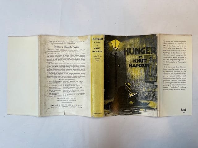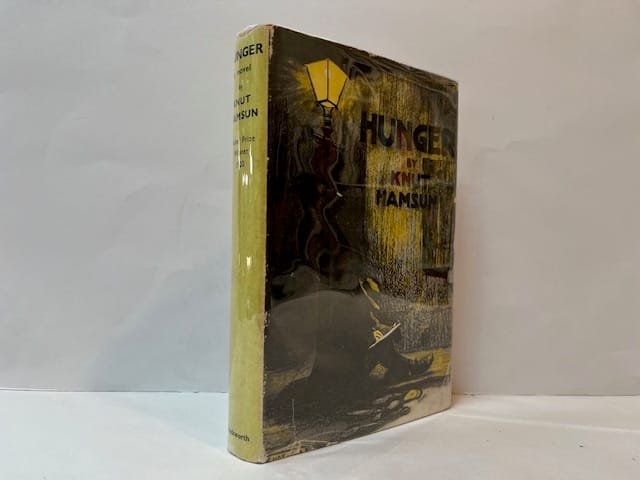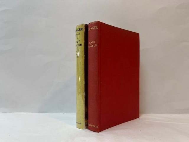 Reprint, 1957. 310pp. With the extremely scarce Warwick Reynolds dust jacket. Publisher’s original cloth with gilt lettering to spine. Slight off-setting to endpapers. Jacket rubbed and chipped, with a few tears to edges.*** Probably the most famous novel by Norwegian writer Knut Hamsun (1859-1952). Hunger was first published in Norwegian (under the title Sult) in 1890. An English translation by George Egerton (pseudonym for Mary Chavelita Dunne) was published by Leonard Smithers in 1899. UK publisher Duckworth re-issued Hunger in 1921 after Hamsun won the Nobel Prize for literature. A new translation by Robert Bly came out in 1974. Our copy is a 1957 reprint of the first Duckworth edition in the very scarce original dust jacket, which was only used for this edition.
