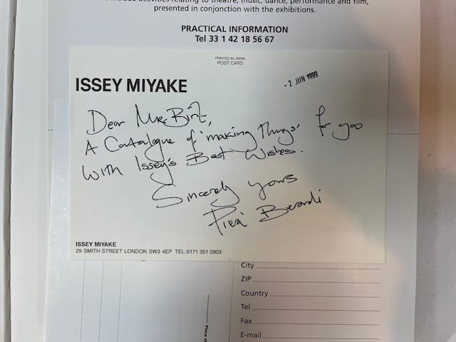First edition. Exhibition catalogue. Hardback in dust jacket. 171pp. With a related inscribed Issey Miyake postcard loosely inserted – “Dear Mr. [John] Birt, A Catalogue of Making Things for you with Issey’s best wishes. Sincerely yours Piera Berardi” [Director of Press & Public Relations Issey Miyake]. Jacket sunned to spine; closed tear to top edge with neat tape repair to reverse. A near fine copy.