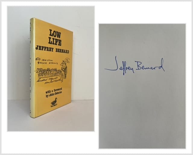 First edition; 1986. Hardback in dust jacket. 192pp. SIGNED by the author to ffe. The slightest traces of foxing to head of text block. Jacket sunned to spine. A near fine copy. *** A selection from Bernard’s Low Life column in The Spectator. With a foreword by John Osborne, a poem by Elizabeth Smart and an autobiographical introduction by Bernard. Numerous photographs throughout. Scarce signed.