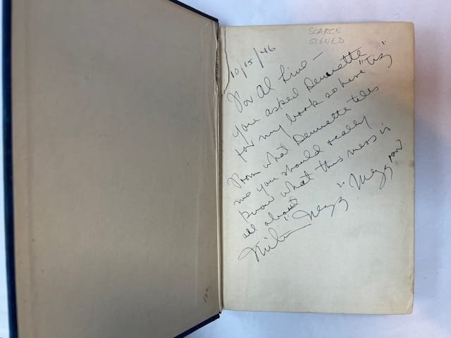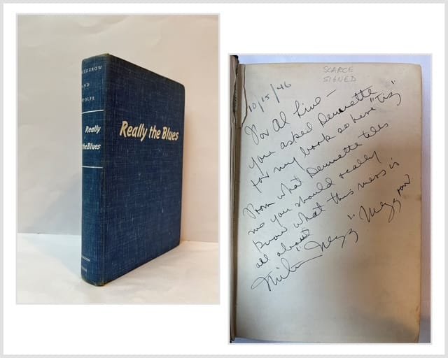 First edition; stated first printing. SIGNED by Mezzrow to ffe with a personal inscription [see below].Publisher’s blue cloth with white lettering to front and spine. Lacking dust jacket. Cloth rubbed to edges. Front gutter split with gauze showing. Otherwise a very good copy. *** Autobiography by jazz clarinetist/saxophonist Mezz Mezzrow, co-written with Bernard Wolfe. An exciting, Beat-like account of the jazz scene in the 1930s and 40s. Mezzrow became better known for his drug dealing than his music to such an extent that Mezz became slang for marijuana. *** The inscription reads: ‘For Al Live [?], you asked Deuvette [?] for my book so here “tiz”. From what Deuvette tells me you should really know what this mess is all about.’
