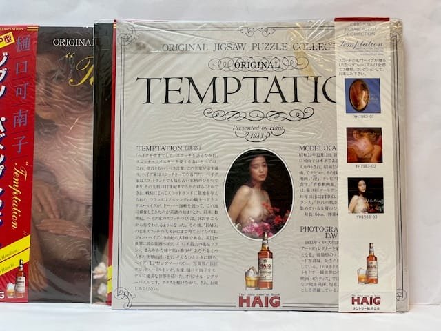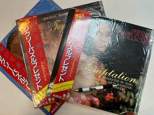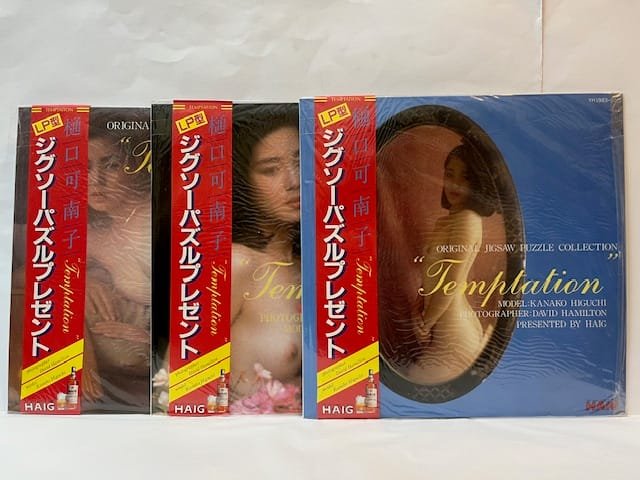 Three jigsaw puzzles in the shape of 12” vinyl records. All three with the original “LP covers” with obi bands as issued. In individual plastic sleeves. Photographer: David Hamilton. Model: Kanako Higuchi. *** Presented by Haig whisky in 1983, issued in Japan only. Text in Japanese to rear. A collection of three erotic jigsaw puzzles. A fine set.