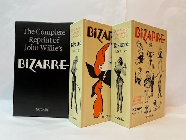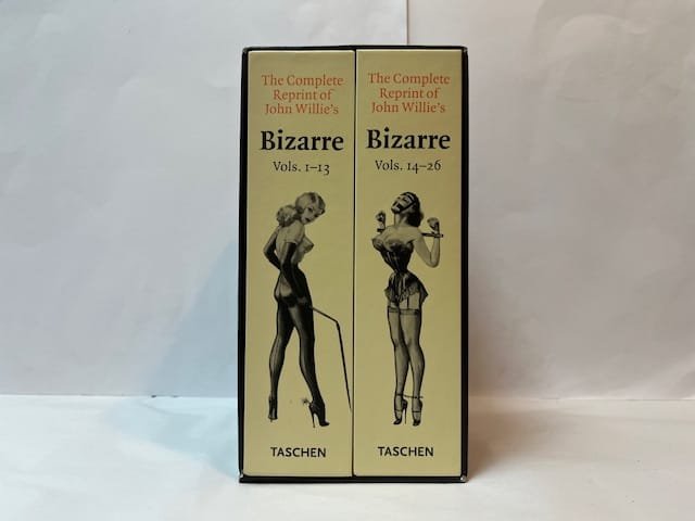 2 vols in slipcase. Pictorial boards. The slightest wear to slipcase. A near fine copy. Introduction by Eric Kroll, in German, French and English. *** A complete facsimile of John Willie’s Bizarre, originally published between 1948 to 1959. Bizarre was a mail-order fetish magazine that had a huge influence on bondage and fetish culture. It contained stories, reader’s contributions, cartoons and lots of illustrations and photographs.