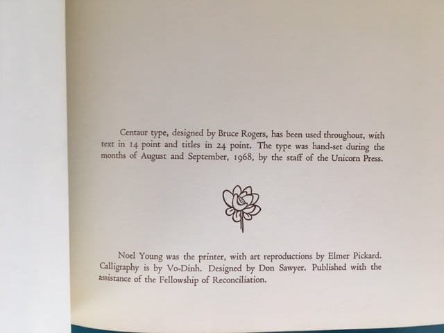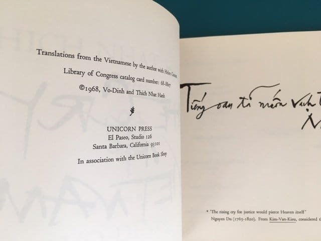 First edition. Portrait 4to. [24x19cm.] Brown card covers with black lettering. Some scratches to upper wrapper with one short closed tear to fore-edge. Poetry by Thich Nhat Hanh interspersed with full-page drawings by Vo-Dinh. Translated from the Vietnamese by the author with Helen Coutant. *** Scarce first edition of this book of war poetry by Vietnamese Buddhist monk (and the “father of mindfulness”) Thich Nhat Hanh (11 October 1926 – 22 January 2022) who was exiled from Vietnam in 1966 after expressing opposition to the war and refusing to take sides. The drawings by Vo-Dinh (1933-2009) are a beautiful accompaniment to the poetry.