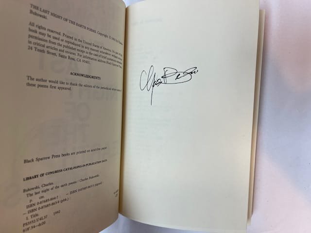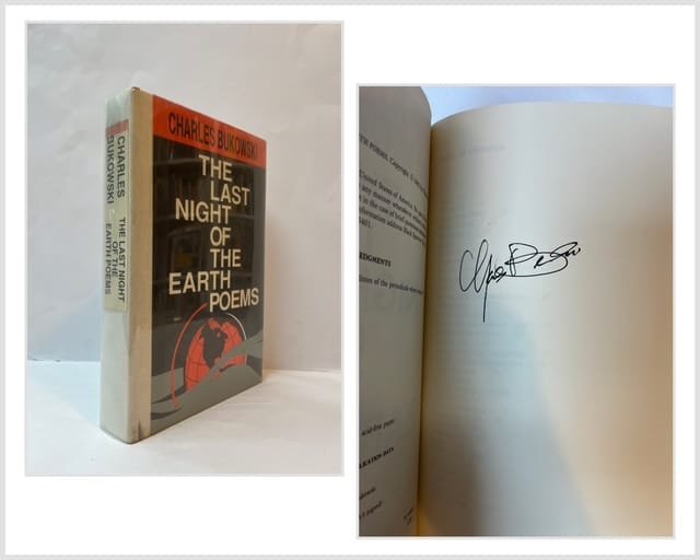 No. 395 of a limited edition of 750 copies, SIGNED by Bukowski to tipped-in page following title page. First edition; with colour title page. Publisher’s cloth backed pictorial boards. Title label to beige spine. In acetate dust jacket as issued. 405pp. Minor rubbing to edges; small black mark to tail of spine; binder’s glue to tail of text block. A near fine copy. *** The last collection of poems by Charles Bukowski (!920-1994) published in his lifetime. Signed copy.